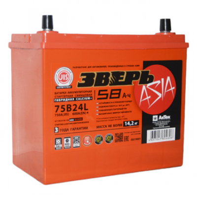 АККУМУЛЯТОРНАЯ БАТАРЕЯ 58 Ач ЗВЕРЬ Asia (75B24R) п/п (600А д*ш*в 23,8*12,9*23,5 см)