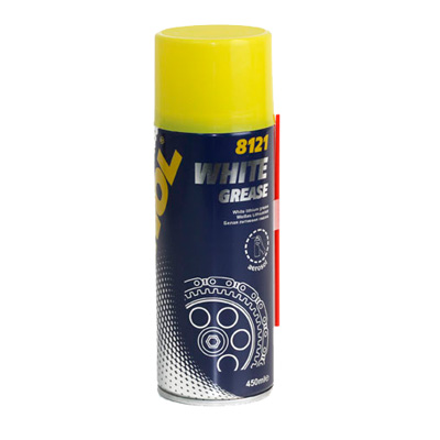MANNOL 8121 WHITE GREASE - белая смазка на литиевой основе, обладающая отличной термоустойчивостью и сопротивлением к вымыванию. Этот продукт применяется для смазки и защиты деталей тормозной системы, клемм аккумуляторов, замков и петель дверей, капотов и багажников, механизмов стеклоочистителей, стеклоподъемников, салазок сидений, металлических рычагов, тросов и других различных движущихся механизмов.