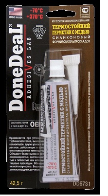 Термостойкий герметик - формирователь прокладок силиконовый с медью Done Deal. Применяется при ремонте или замене турбокомпрессоров, выпускных коллекторов, других узлов и агрегатов двигателя и трансмиссии, подверженных повышенным рабочим температурам. Заменяет любые заводские силиконовые прокладочные материалы, штатные твердые и резиновые прокладки. Дополнительное нанесение на штатные прокладки (кроме прокладки головки блока) улучшает их служебные свойства и теплопроводность. Устойчив к перепадам температуры и вибрации, воздействию автомобильных жидкостей (не рекомендуется длительный контакт с бензином). За счет содержания меди обладает повышенной термостойкостью и долговечностью. После вулканизации сохраняет эластичность и приобретает водостойкость. Рабочий диапазон температур: от -70°C до +370°C.Производитель: HI-GEAR – США