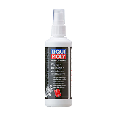Liqui Moly Motorbike Visier-Reiniger - Очиститель забрал шлемов. Очищает забрала мотошлемов и создаёт покрытие, препятствующее запотеванию. Удаляет пыль, грязь, жиры, силиконы и остатки насекомых с забрал из любых полимерных материалов: поликарбоната, полиметилметакрилата, полистирола и т.п. Не оставляет мутной пленки после высыхания, не повреждает обрабатываемые материалы.