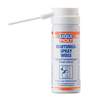Liqui Moly Wartungs-Spray weiss - Грязеотталкивающая белая смазка. Смазка для узлов, не допускающих попадание в смазку грязи, пыли и влаги: для автомобильных дверных замков, замков багажника и капота. Образованный мягкий слой не липкой смазки плотно прилипает к месту контакта, снижает трение деталей и защищает от попадания грязи или примерзания деталей. Защищает от коррозии.